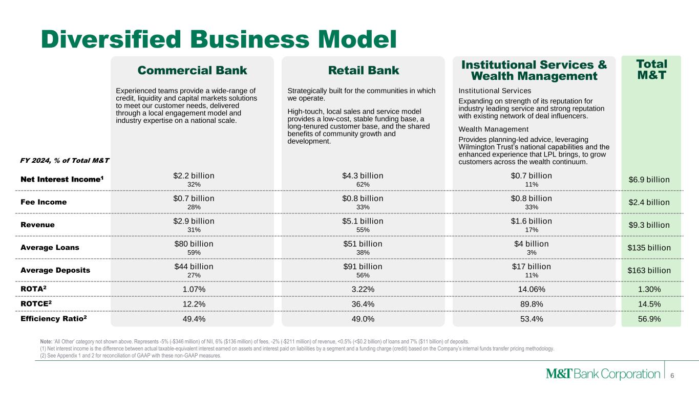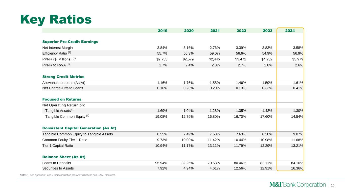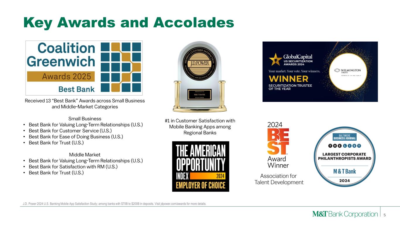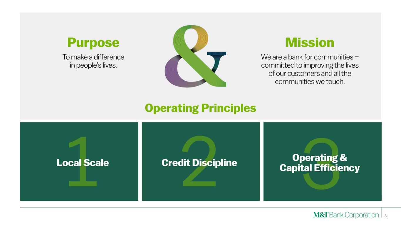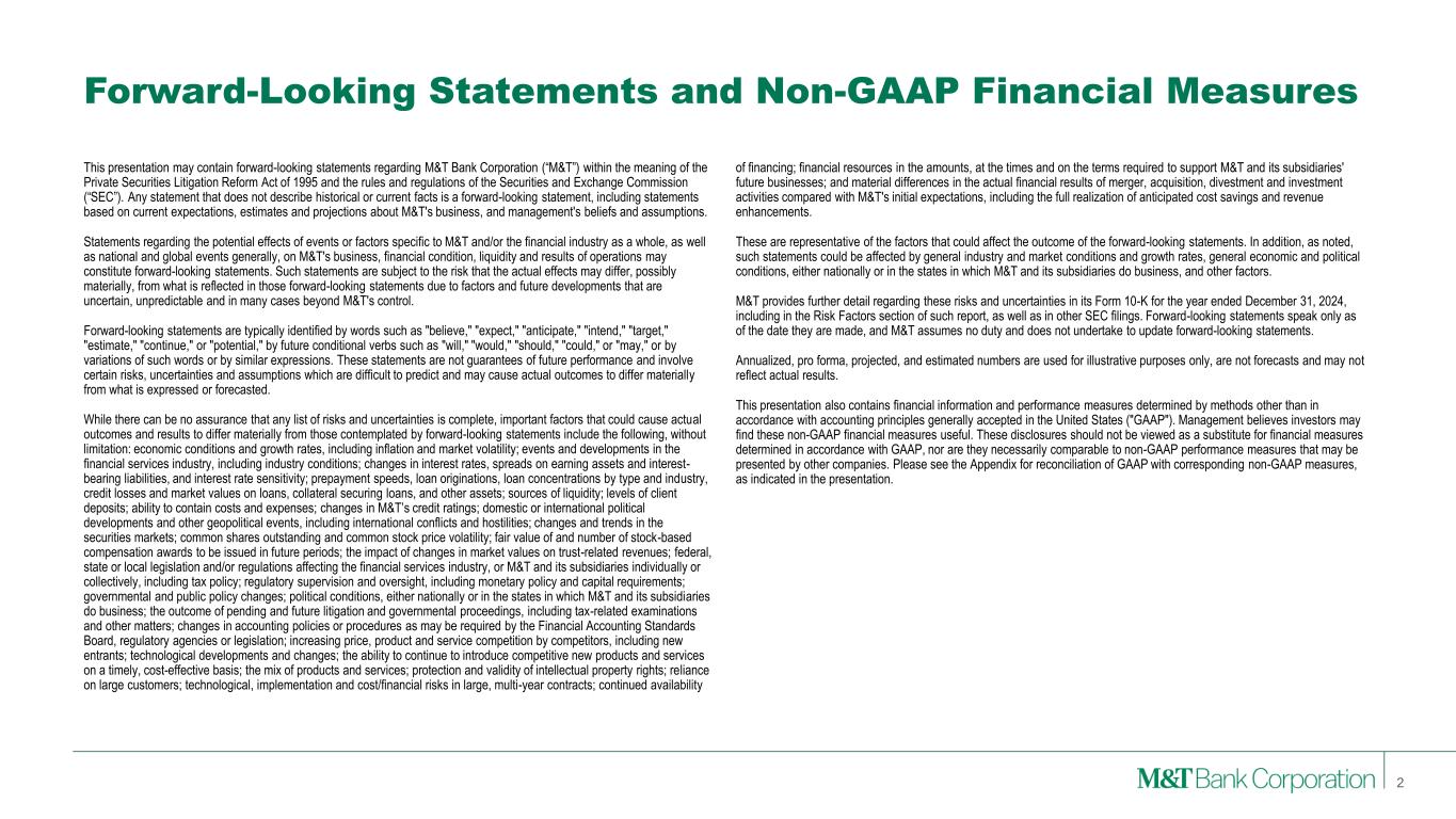 Forward-Looking Statements and Non-GAAP Financial Measures This presentation may contain forward-looking statements regarding M&T Bank Corporation (“M&T”) within the meaning of the Private Securities Litigation Reform Act of 1995 and the rules and regulations of the Securities and Exchange Commission (“SEC”). Any statement that does not describe historical or current facts is a forward-looking statement, including statements based on current expectations, estimates and projections about M&T's business, and management's beliefs and assumptions. Statements regarding the potential effects of events or factors specific to M&T and/or the financial industry as a whole, as well as national and global events generally, on M&T's business, financial condition, liquidity and results of operations may constitute forward-looking statements. Such statements are subject to the risk that the actual effects may differ, possibly materially, from what is reflected in those forward-looking statements due to factors and future developments that are uncertain, unpredictable and in many cases beyond M&T's control. Forward-looking statements are typically identified by words such as "believe," "expect," "anticipate," "intend," "target," "estimate," "continue," or "potential," by future conditional verbs such as "will," "would," "should," "could," or "may," or by variations of such words or by similar expressions. These statements are not guarantees of future performance and involve certain risks, uncertainties and assumptions which are difficult to predict and may cause actual outcomes to differ materially from what is expressed or forecasted. While there can be no assurance that any list of risks and uncertainties is complete, important factors that could cause actual outcomes and results to differ materially from those contemplated by forward-looking statements include the following, without limitation: economic conditions and growth rates, including inflation and market volatility; events and developments in the financial services industry, including industry conditions; changes in interest rates, spreads on earning assets and interest- bearing liabilities, and interest rate sensitivity; prepayment speeds, loan originations, loan concentrations by type and industry, credit losses and market values on loans, collateral securing loans, and other assets; sources of liquidity; levels of client deposits; ability to contain costs and expenses; changes in M&T’s credit ratings; domestic or international political developments and other geopolitical events, including international conflicts and hostilities; changes and trends in the securities markets; common shares outstanding and common stock price volatility; fair value of and number of stock-based compensation awards to be issued in future periods; the impact of changes in market values on trust-related revenues; federal, state or local legislation and/or regulations affecting the financial services industry, or M&T and its subsidiaries individually or collectively, including tax policy; regulatory supervision and oversight, including monetary policy and capital requirements; governmental and public policy changes; political conditions, either nationally or in the states in which M&T and its subsidiaries do business; the outcome of pending and future litigation and governmental proceedings, including tax-related examinations and other matters; changes in accounting policies or procedures as may be required by the Financial Accounting Standards Board, regulatory agencies or legislation; increasing price, product and service competition by competitors, including new entrants; technological developments and changes; the ability to continue to introduce competitive new products and services on a timely, cost-effective basis; the mix of products and services; protection and validity of intellectual property rights; reliance on large customers; technological, implementation and cost/financial risks in large, multi-year contracts; continued availability of financing; financial resources in the amounts, at the times and on the terms required to support M&T and its subsidiaries' future businesses; and material differences in the actual financial results of merger, acquisition, divestment and investment activities compared with M&T's initial expectations, including the full realization of anticipated cost savings and revenue enhancements. These are representative of the factors that could affect the outcome of the forward-looking statements. In addition, as noted, such statements could be affected by general industry and market conditions and growth rates, general economic and political conditions, either nationally or in the states in which M&T and its subsidiaries do business, and other factors. M&T provides further detail regarding these risks and uncertainties in its Form 10-K for the year ended December 31, 2024, including in the Risk Factors section of such report, as well as in other SEC filings. Forward-looking statements speak only as of the date they are made, and M&T assumes no duty and does not undertake to update forward-looking statements. Annualized, pro forma, projected, and estimated numbers are used for illustrative purposes only, are not forecasts and may not reflect actual results. This presentation also contains financial information and performance measures determined by methods other than in accordance with accounting principles generally accepted in the United States ("GAAP"). Management believes investors may find these non-GAAP financial measures useful. These disclosures should not be viewed as a substitute for financial measures determined in accordance with GAAP, nor are they necessarily comparable to non-GAAP performance measures that may be presented by other companies. Please see the Appendix for reconciliation of GAAP with corresponding non-GAAP measures, as indicated in the presentation. 2