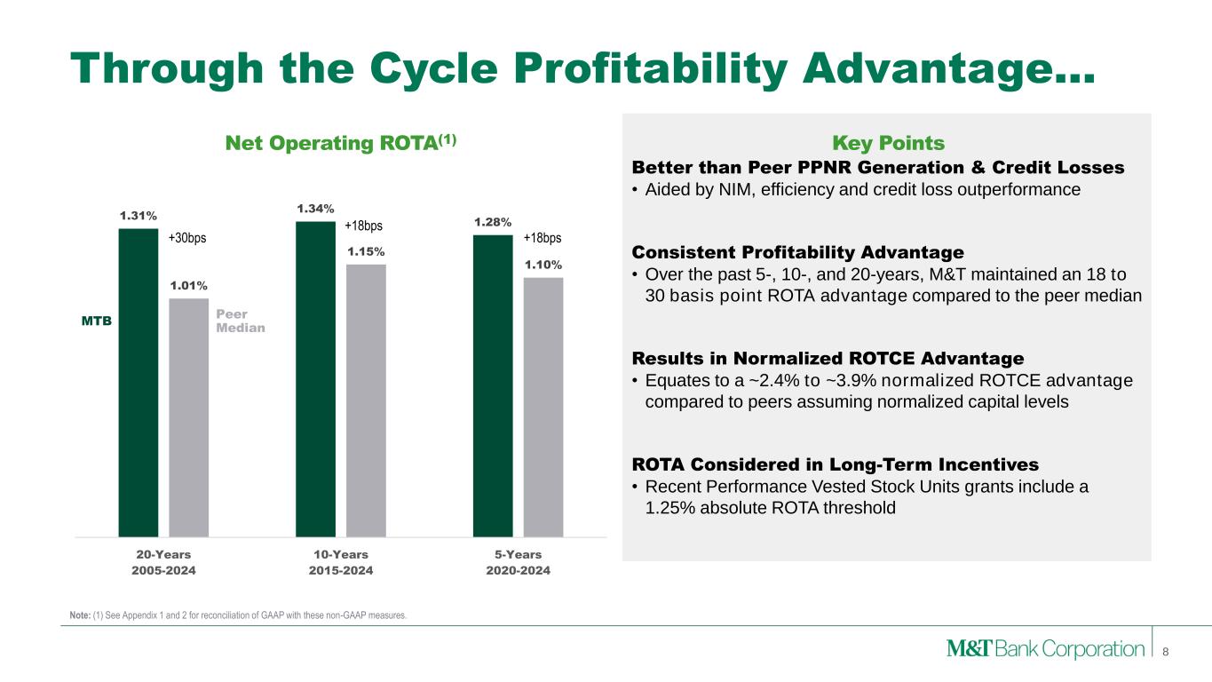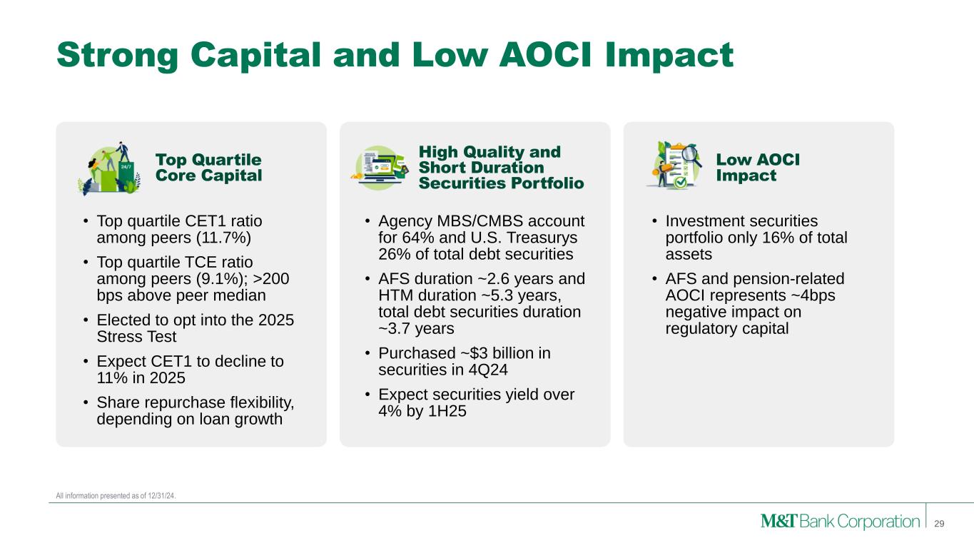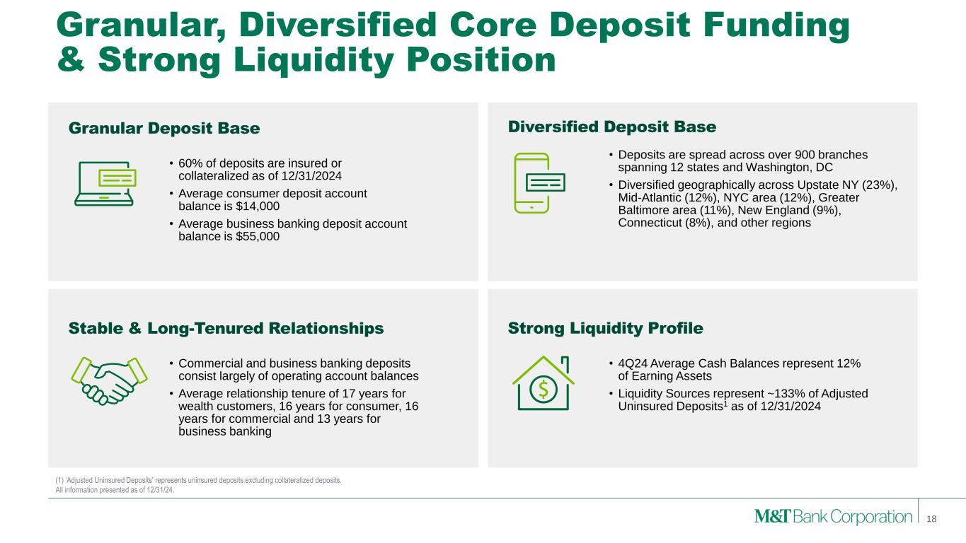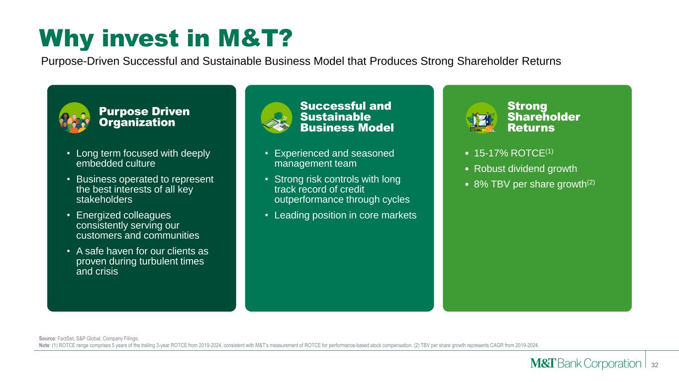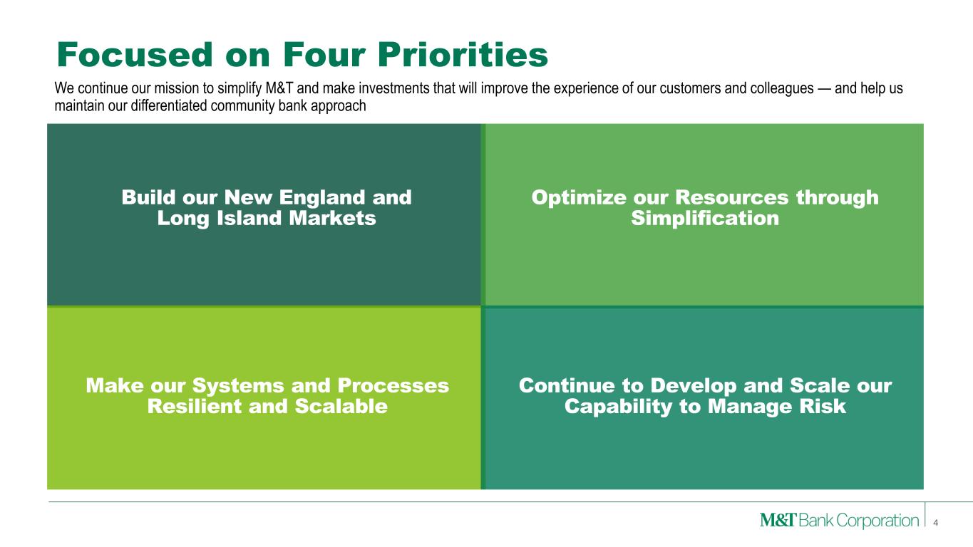 Forward-Looking Statements and Non-GAAP Financial Measures This presentation may contain forward-looking statements regarding M&T Bank Corporation (“M&T”) within the meaning of the Private Securities Litigation Reform Act of 1995 and the rules and regulations of the Securities and Exchange Commission (“SEC”). Any statement that does not describe historical or current facts is a forward-looking statement, including statements based on current expectations, estimates and projections about M&T's business, and management's beliefs and assumptions. Statements regarding the potential effects of events or factors specific to M&T and/or the financial industry as a whole, as well as national and global events generally, on M&T's business, financial condition, liquidity and results of operations may constitute forward-looking statements. Such statements are subject to the risk that the actual effects may differ, possibly materially, from what is reflected in those forward-looking statements due to factors and future developments that are uncertain, unpredictable and in many cases beyond M&T's control. Forward-looking statements are typically identified by words such as "believe," "expect," "anticipate," "intend," "target," "estimate," "continue," or "potential," by future conditional verbs such as "will," "would," "should," "could," or "may," or by variations of such words or by similar expressions. These statements are not guarantees of future performance and involve certain risks, uncertainties and assumptions which are difficult to predict and may cause actual outcomes to differ materially from what is expressed or forecasted. While there can be no assurance that any list of risks and uncertainties is complete, important factors that could cause actual outcomes and results to differ materially from those contemplated by forward-looking statements include the following, without limitation: economic conditions and growth rates, including inflation and market volatility; events and developments in the financial services industry, including industry conditions; changes in interest rates, spreads on earning assets and interest- bearing liabilities, and interest rate sensitivity; prepayment speeds, loan originations, loan concentrations by type and industry, credit losses and market values on loans, collateral securing loans, and other assets; sources of liquidity; levels of client deposits; ability to contain costs and expenses; changes in M&T’s credit ratings; domestic or international political developments and other geopolitical events, including international conflicts and hostilities; changes and trends in the securities markets; common shares outstanding and common stock price volatility; fair value of and number of stock-based compensation awards to be issued in future periods; the impact of changes in market values on trust-related revenues; federal, state or local legislation and/or regulations affecting the financial services industry, or M&T and its subsidiaries individually or collectively, including tax policy; regulatory supervision and oversight, including monetary policy and capital requirements; governmental and public policy changes; political conditions, either nationally or in the states in which M&T and its subsidiaries do business; the outcome of pending and future litigation and governmental proceedings, including tax-related examinations and other matters; changes in accounting policies or procedures as may be required by the Financial Accounting Standards Board, regulatory agencies or legislation; increasing price, product and service competition by competitors, including new entrants; technological developments and changes; the ability to continue to introduce competitive new products and services on a timely, cost-effective basis; the mix of products and services; protection and validity of intellectual property rights; reliance on large customers; technological, implementation and cost/financial risks in large, multi-year contracts; continued availability of financing; financial resources in the amounts, at the times and on the terms required to support M&T and its subsidiaries' future businesses; and material differences in the actual financial results of merger, acquisition, divestment and investment activities compared with M&T's initial expectations, including the full realization of anticipated cost savings and revenue enhancements. These are representative of the factors that could affect the outcome of the forward-looking statements. In addition, as noted, such statements could be affected by general industry and market conditions and growth rates, general economic and political conditions, either nationally or in the states in which M&T and its subsidiaries do business, and other factors. M&T provides further detail regarding these risks and uncertainties in its Form 10-K for the year ended December 31, 2024, including in the Risk Factors section of such report, as well as in other SEC filings. Forward-looking statements speak only as of the date they are made, and M&T assumes no duty and does not undertake to update forward-looking statements. Annualized, pro forma, projected, and estimated numbers are used for illustrative purposes only, are not forecasts and may not reflect actual results. This presentation also contains financial information and performance measures determined by methods other than in accordance with accounting principles generally accepted in the United States ("GAAP"). Management believes investors may find these non-GAAP financial measures useful. These disclosures should not be viewed as a substitute for financial measures determined in accordance with GAAP, nor are they necessarily comparable to non-GAAP performance measures that may be presented by other companies. Please see the Appendix for reconciliation of GAAP with corresponding non-GAAP measures, as indicated in the presentation. 2