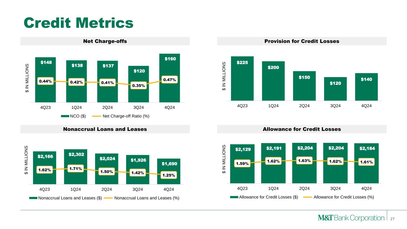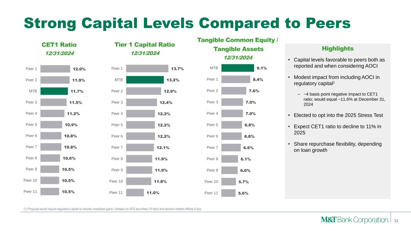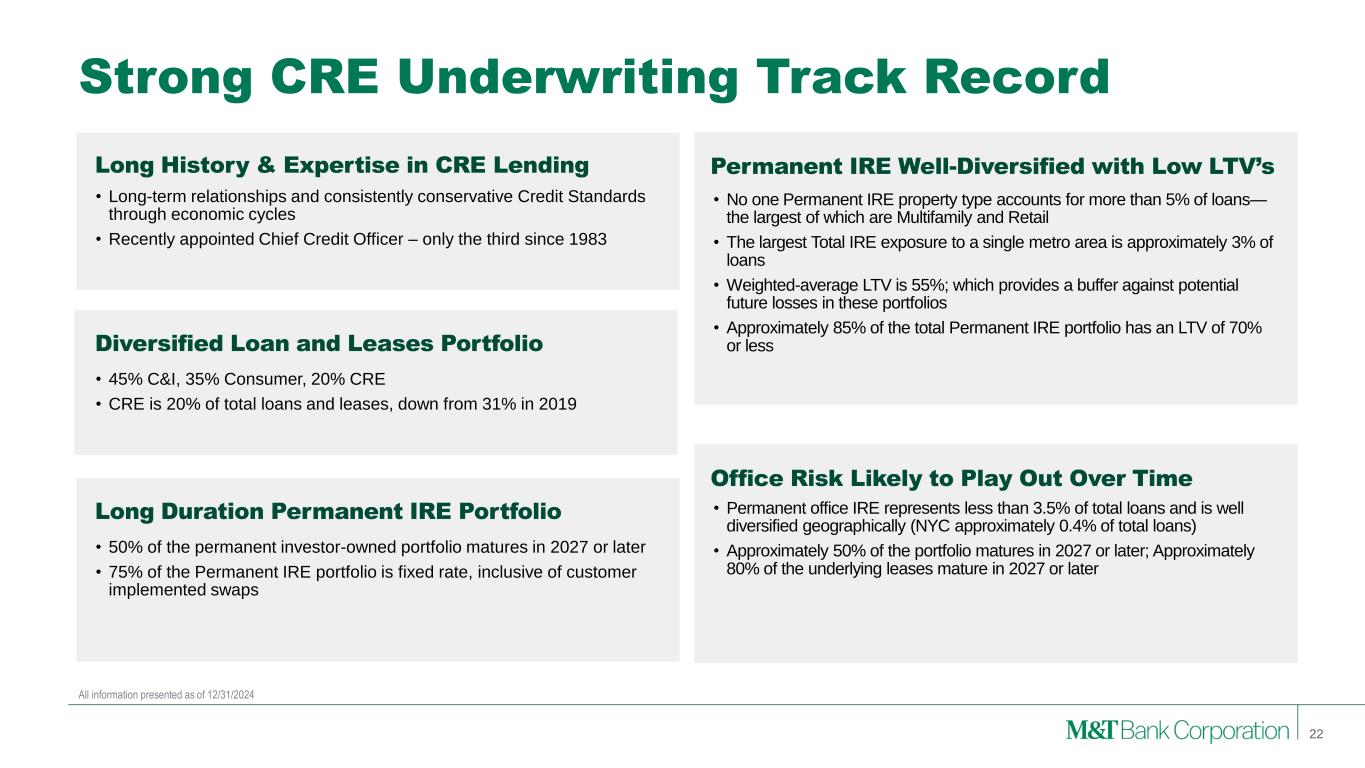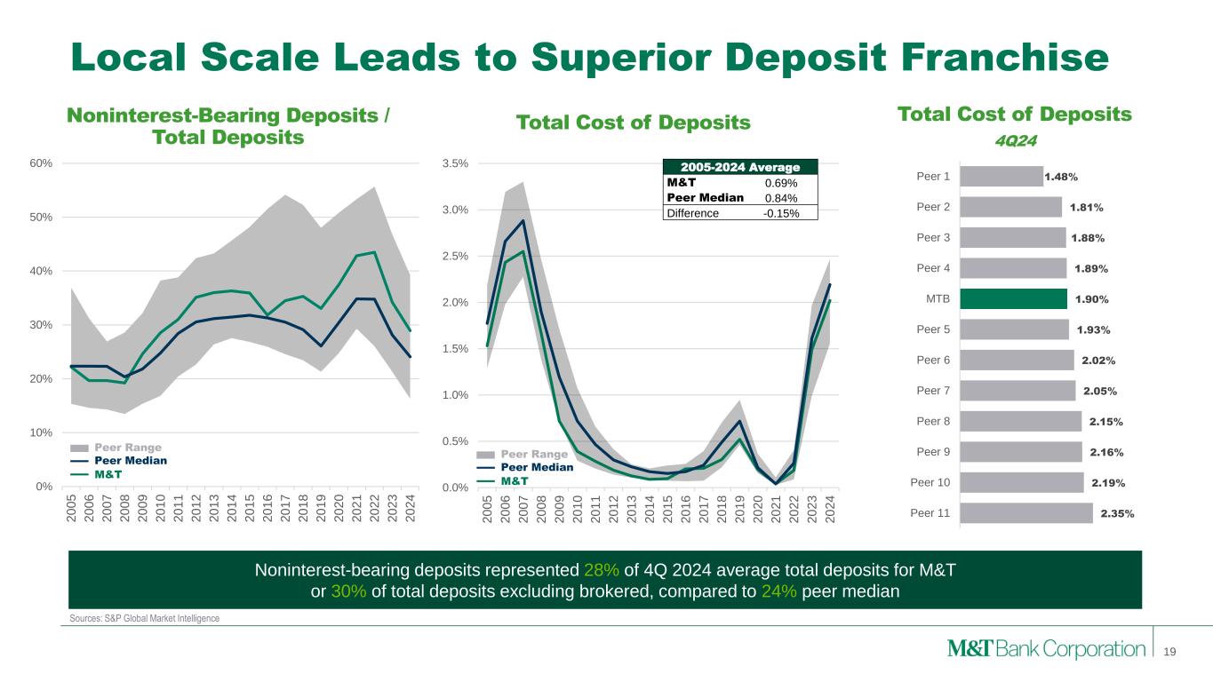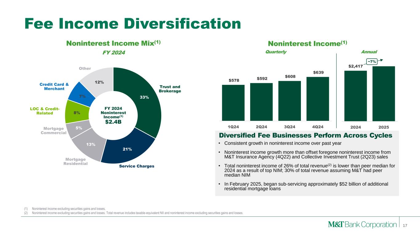 Forward-Looking Statements and Non-GAAP Financial Measures This presentation may contain forward-looking statements regarding M&T Bank Corporation (“M&T”) within the meaning of the Private Securities Litigation Reform Act of 1995 and the rules and regulations of the Securities and Exchange Commission (“SEC”). Any statement that does not describe historical or current facts is a forward-looking statement, including statements based on current expectations, estimates and projections about M&T's business, and management's beliefs and assumptions. Statements regarding the potential effects of events or factors specific to M&T and/or the financial industry as a whole, as well as national and global events generally, on M&T's business, financial condition, liquidity and results of operations may constitute forward-looking statements. Such statements are subject to the risk that the actual effects may differ, possibly materially, from what is reflected in those forward-looking statements due to factors and future developments that are uncertain, unpredictable and in many cases beyond M&T's control. Forward-looking statements are typically identified by words such as "believe," "expect," "anticipate," "intend," "target," "estimate," "continue," or "potential," by future conditional verbs such as "will," "would," "should," "could," or "may," or by variations of such words or by similar expressions. These statements are not guarantees of future performance and involve certain risks, uncertainties and assumptions which are difficult to predict and may cause actual outcomes to differ materially from what is expressed or forecasted. While there can be no assurance that any list of risks and uncertainties is complete, important factors that could cause actual outcomes and results to differ materially from those contemplated by forward-looking statements include the following, without limitation: economic conditions and growth rates, including inflation and market volatility; events and developments in the financial services industry, including industry conditions; changes in interest rates, spreads on earning assets and interest- bearing liabilities, and interest rate sensitivity; prepayment speeds, loan originations, loan concentrations by type and industry, credit losses and market values on loans, collateral securing loans, and other assets; sources of liquidity; levels of client deposits; ability to contain costs and expenses; changes in M&T’s credit ratings; domestic or international political developments and other geopolitical events, including international conflicts and hostilities; changes and trends in the securities markets; common shares outstanding and common stock price volatility; fair value of and number of stock-based compensation awards to be issued in future periods; the impact of changes in market values on trust-related revenues; federal, state or local legislation and/or regulations affecting the financial services industry, or M&T and its subsidiaries individually or collectively, including tax policy; regulatory supervision and oversight, including monetary policy and capital requirements; governmental and public policy changes; political conditions, either nationally or in the states in which M&T and its subsidiaries do business; the outcome of pending and future litigation and governmental proceedings, including tax-related examinations and other matters; changes in accounting policies or procedures as may be required by the Financial Accounting Standards Board, regulatory agencies or legislation; increasing price, product and service competition by competitors, including new entrants; technological developments and changes; the ability to continue to introduce competitive new products and services on a timely, cost-effective basis; the mix of products and services; protection and validity of intellectual property rights; reliance on large customers; technological, implementation and cost/financial risks in large, multi-year contracts; continued availability of financing; financial resources in the amounts, at the times and on the terms required to support M&T and its subsidiaries' future businesses; and material differences in the actual financial results of merger, acquisition, divestment and investment activities compared with M&T's initial expectations, including the full realization of anticipated cost savings and revenue enhancements. These are representative of the factors that could affect the outcome of the forward-looking statements. In addition, as noted, such statements could be affected by general industry and market conditions and growth rates, general economic and political conditions, either nationally or in the states in which M&T and its subsidiaries do business, and other factors. M&T provides further detail regarding these risks and uncertainties in its Form 10-K for the year ended December 31, 2024, including in the Risk Factors section of such report, as well as in other SEC filings. Forward-looking statements speak only as of the date they are made, and M&T assumes no duty and does not undertake to update forward-looking statements. Annualized, pro forma, projected, and estimated numbers are used for illustrative purposes only, are not forecasts and may not reflect actual results. This presentation also contains financial information and performance measures determined by methods other than in accordance with accounting principles generally accepted in the United States ("GAAP"). Management believes investors may find these non-GAAP financial measures useful. These disclosures should not be viewed as a substitute for financial measures determined in accordance with GAAP, nor are they necessarily comparable to non-GAAP performance measures that may be presented by other companies. Please see the Appendix for reconciliation of GAAP with corresponding non-GAAP measures, as indicated in the presentation. 2