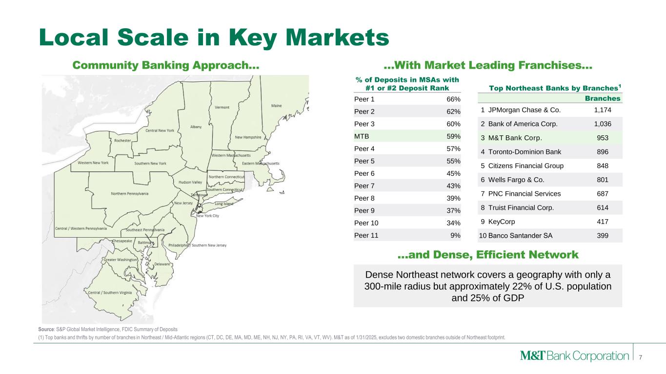 Diversified Business Model Experienced teams provide a wide-range of credit, liquidity and capital markets solutions to meet our customer needs, delivered through a local engagement model and industry expertise on a national scale. Strategically built for the communities in which we operate. High-touch, local sales and service model provides a low-cost, stable funding base, a long-tenured customer base, and the shared benefits of community growth and development. 6 Institutional Services Expanding on strength of its reputation for industry leading service and strong reputation with existing network of deal influencers. Wealth Management Provides planning-led advice, leveraging Wilmington Trust’s national capabilities and the enhanced experience that LPL brings, to grow customers across the wealth continuum. Note: ‘All Other’ category not shown above. Represents -5% (-$346 million) of NII, 6% ($136 million) of fees, -2% (-$211 million) of revenue, <0.5% (<$0.2 billion) of loans and 7% ($11 billion) of deposits. (1) Net interest income is the difference between actual taxable-equivalent interest earned on assets and interest paid on liabilities by a segment and a funding charge (credit) based on the Company’s internal funds transfer pricing methodology. (2) See Appendix 1 and 2 for reconciliation of GAAP with these non-GAAP measures. Commercial Bank Retail Bank Institutional Services & Wealth Management Net Interest Income1 $2.2 billion 32% $4.3 billion 62% $0.7 billion 11% $6.9 billion Fee Income $0.7 billion 28% $0.8 billion 33% $0.8 billion 33% $2.4 billion Revenue $2.9 billion 31% $5.1 billion 55% $1.6 billion 17% $9.3 billion Average Loans $80 billion 59% $51 billion 38% $4 billion 3% $135 billion Average Deposits $44 billion 27% $91 billion 56% $17 billion 11% $163 billion ROTA2 1.07% 3.22% 14.06% 1.30% ROTCE2 12.2% 36.4% 89.8% 14.5% Efficiency Ratio2 49.4% 49.0% 53.4% 56.9% FY 2024, % of Total M&T Total M&T