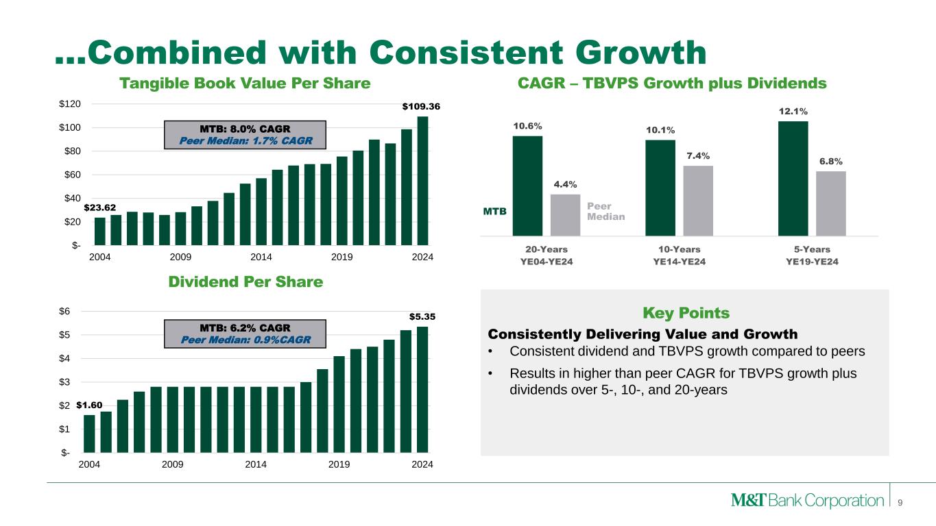 Through the Cycle Profitability Advantage… 8 Note: (1) See Appendix 1 and 2 for reconciliation of GAAP with these non-GAAP measures. Net Operating ROTA(1) Better than Peer PPNR Generation & Credit Losses • Aided by NIM, efficiency and credit loss outperformance Consistent Profitability Advantage • Over the past 5-, 10-, and 20-years, M&T maintained an 18 to 30 basis point ROTA advantage compared to the peer median Results in Normalized ROTCE Advantage • Equates to a ~2.4% to ~3.9% normalized ROTCE advantage compared to peers assuming normalized capital levels ROTA Considered in Long-Term Incentives • Recent Performance Vested Stock Units grants include a 1.25% absolute ROTA threshold +30bps +18bps +18bps Key Points MTB Peer Median 1.31% 1.34% 1.28% 1.01% 1.15% 1.10% 20-Years 2005-2024 10-Years 2015-2024 5-Years 2020-2024