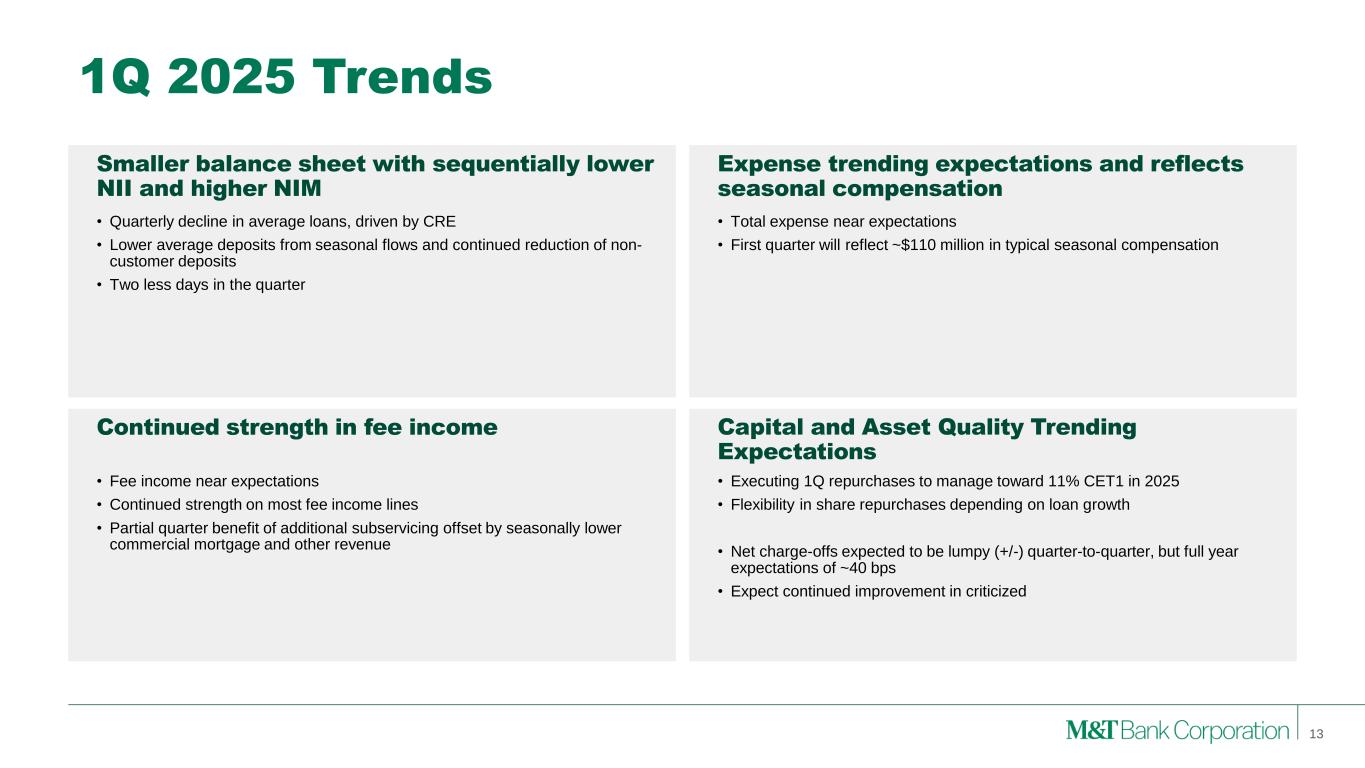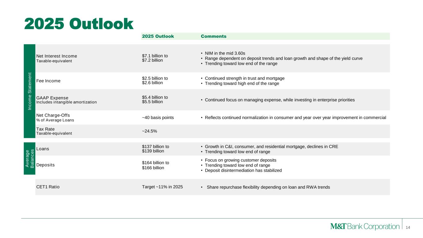 1Q 2025 Trends Smaller balance sheet with sequentially lower NII and higher NIM Expense trending expectations and reflects seasonal compensation Continued strength in fee income Capital and Asset Quality Trending Expectations • Quarterly decline in average loans, driven by CRE • Lower average deposits from seasonal flows and continued reduction of non- customer deposits • Two less days in the quarter • Total expense near expectations • First quarter will reflect ~$110 million in typical seasonal compensation • Fee income near expectations • Continued strength on most fee income lines • Partial quarter benefit of additional subservicing offset by seasonally lower commercial mortgage and other revenue • Executing 1Q repurchases to manage toward 11% CET1 in 2025 • Flexibility in share repurchases depending on loan growth • Net charge-offs expected to be lumpy (+/-) quarter-to-quarter, but full year expectations of ~40 bps • Expect continued improvement in criticized 13