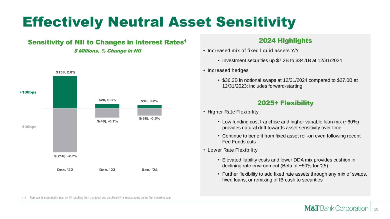 2025 Outlook 14 2025 Outlook Comments In c o m e S ta te m e n t Net Interest Income Taxable-equivalent $7.1 billion to $7.2 billion • NIM in the mid 3.60s • Range dependent on deposit trends and loan growth and shape of the yield curve • Trending toward low end of the range Fee Income $2.5 billion to $2.6 billion • Continued strength in trust and mortgage • Trending toward high end of the range GAAP Expense Includes intangible amortization $5.4 billion to $5.5 billion • Continued focus on managing expense, while investing in enterprise priorities Net Charge-Offs % of Average Loans ~40 basis points • Reflects continued normalization in consumer and year over year improvement in commercial Tax Rate Taxable-equivalent ~24.5% A v e ra g e B a la n c e s Loans $137 billion to $139 billion • Growth in C&I, consumer, and residential mortgage, declines in CRE • Trending toward low end of range Deposits $164 billion to $166 billion • Focus on growing customer deposits • Trending toward low end of range • Deposit disintermediation has stabilized CET1 Ratio Target ~11% in 2025 • Share repurchase flexibility depending on loan and RWA trends
