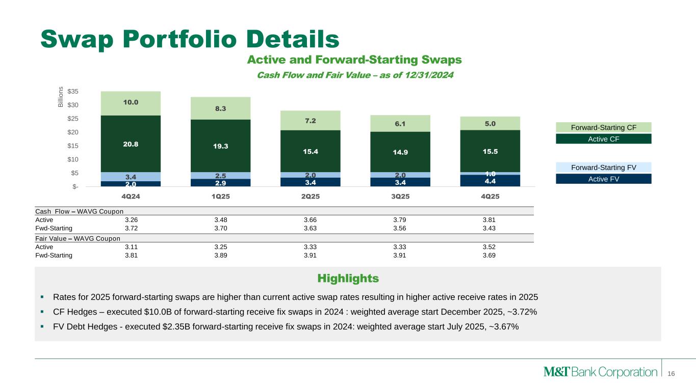 $158, 2.0% $20, 0.3% $16, 0.2% $(216), -2.7% $(46), -0.7% $(36), -0.5% Dec. '22 Dec. '23 Dec. '24 Effectively Neutral Asset Sensitivity (1) Represents estimated impact on NII resulting from a gradual and parallel shift in interest rates during first modeling year. Sensitivity of NII to Changes in Interest Rates1 $ Millions, % Change in NII • Increased mix of fixed liquid assets Y/Y • Investment securities up $7.2B to $34.1B at 12/31/2024 • Increased hedges • $36.2B in notional swaps at 12/31/2024 compared to $27.0B at 12/31/2023; includes forward-starting • Higher Rate Flexibility • Low funding cost franchise and higher variable loan mix (~60%) provides natural drift towards asset sensitivity over time • Continue to benefit from fixed asset roll-on even following recent Fed Funds cuts • Lower Rate Flexibility • Elevated liability costs and lower DDA mix provides cushion in declining rate environment (Beta of ~50% for ‘25) • Further flexibility to add fixed rate assets through any mix of swaps, fixed loans, or remixing of IB cash to securities 2024 Highlights 15 +100bps -100bps 2025+ Flexibility