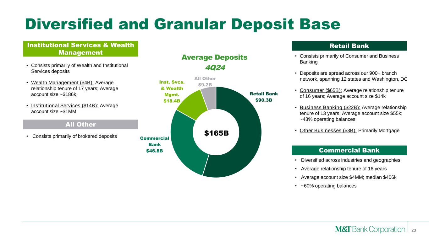2.35% 2.19% 2.16% 2.15% 2.05% 2.02% 1.93% 1.90% 1.89% 1.88% 1.81% 1.48% Peer 11 Peer 10 Peer 9 Peer 8 Peer 7 Peer 6 Peer 5 MTB Peer 4 Peer 3 Peer 2 Peer 1 0% 10% 20% 30% 40% 50% 60% 2 0 0 5 2 0 0 6 2 0 0 7 2 0 0 8 2 0 0 9 2 0 1 0 2 0 1 1 2 0 1 2 2 0 1 3 2 0 1 4 2 0 1 5 2 0 1 6 2 0 1 7 2 0 1 8 2 0 1 9 2 0 2 0 2 0 2 1 2 0 2 2 2 0 2 3 2 0 2 4 0.0% 0.5% 1.0% 1.5% 2.0% 2.5% 3.0% 3.5% 2 0 0 5 2 0 0 6 2 0 0 7 2 0 0 8 2 0 0 9 2 0 1 0 2 0 1 1 2 0 1 2 2 0 1 3 2 0 1 4 2 0 1 5 2 0 1 6 2 0 1 7 2 0 1 8 2 0 1 9 2 0 2 0 2 0 2 1 2 0 2 2 2 0 2 3 2 0 2 4 Sources: S&P Global Market Intelligence Local Scale Leads to Superior Deposit Franchise Noninterest-bearing deposits represented 28% of 4Q 2024 average total deposits for M&T or 30% of total deposits excluding brokered, compared to 24% peer median 2005-2024 Average M&T 0.69% Peer Median 0.84% Difference -0.15% Noninterest-Bearing Deposits / Total Deposits Total Cost of Deposits 19 M&T Peer Median Peer Range Total Cost of Deposits 4Q24 M&T Peer Median Peer Range