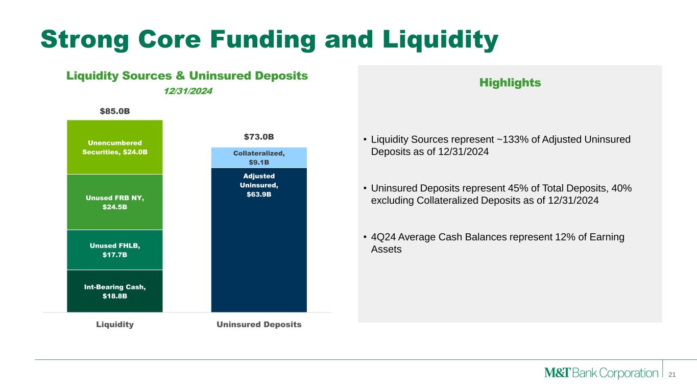 Diversified and Granular Deposit Base • Diversified across industries and geographies • Average relationship tenure of 16 years • Average account size $4MM; median $406k • ~60% operating balances Average Deposits 4Q24 Institutional Services & Wealth Management Retail Bank Commercial Bank • Consists primarily of Consumer and Business Banking • Deposits are spread across our 900+ branch network, spanning 12 states and Washington, DC • Consumer ($65B): Average relationship tenure of 16 years; Average account size $14k • Business Banking ($22B): Average relationship tenure of 13 years; Average account size $55k; ~43% operating balances • Other Businesses ($3B): Primarily Mortgage • Consists primarily of Wealth and Institutional Services deposits • Wealth Management ($4B): Average relationship tenure of 17 years; Average account size ~$186k • Institutional Services ($14B): Average account size ~$1MM 20 $165B All Other • Consists primarily of brokered deposits Retail Bank $90.3B Commercial Bank $46.8B Inst. Svcs. & Wealth Mgmt. $18.4B All Other $9.2B