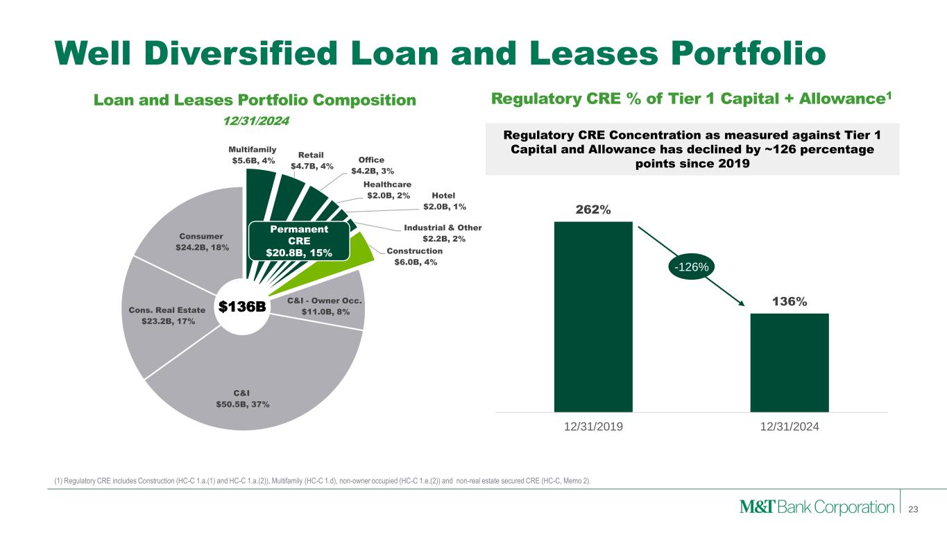 Multifamily $5.6B, 4% Retail $4.7B, 4% Office $4.2B, 3% Healthcare $2.0B, 2% Hotel $2.0B, 1% Industrial & Other $2.2B, 2% Construction $6.0B, 4% C&I - Owner Occ. $11.0B, 8% C&I $50.5B, 37% Cons. Real Estate $23.2B, 17% Consumer $24.2B, 18% Permanent CRE $20.8B, 15% Well Diversified Loan and Leases Portfolio (1) Regulatory CRE includes Construction (HC-C 1.a.(1) and HC-C 1.a.(2)), Multifamily (HC-C 1.d), non-owner occupied (HC-C 1.e.(2)) and non-real estate secured CRE (HC-C, Memo 2). Loan and Leases Portfolio Composition 12/31/2024 Regulatory CRE % of Tier 1 Capital + Allowance1 Regulatory CRE Concentration as measured against Tier 1 Capital and Allowance has declined by ~126 percentage points since 2019 $136B 23 262% 136% 12/31/2019 12/31/2024 -126%