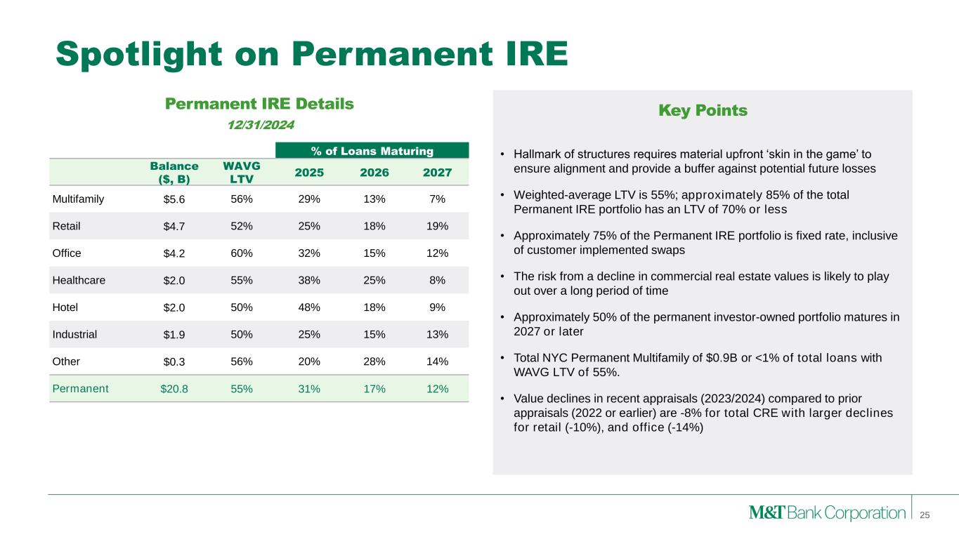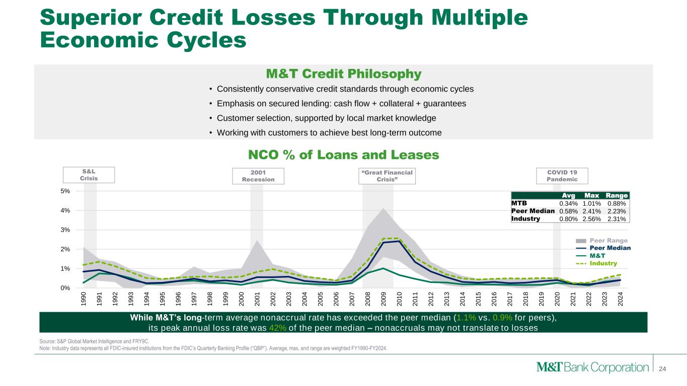 Source: S&P Global Market Intelligence and FRY9C. Note: Industry data represents all FDIC-insured institutions from the FDIC’s Quarterly Banking Profile (“QBP”). Average, max, and range are weighted FY1990-FY2024. Superior Credit Losses Through Multiple Economic Cycles M&T Credit Philosophy NCO % of Loans and Leases • Consistently conservative credit standards through economic cycles • Emphasis on secured lending: cash flow + collateral + guarantees • Customer selection, supported by local market knowledge • Working with customers to achieve best long-term outcome “Great Financial Crisis” 2001 Recession S&L Crisis While M&T’s long-term average nonaccrual rate has exceeded the peer median (1.1% vs. 0.9% for peers), its peak annual loss rate was 42% of the peer median – nonaccruals may not translate to losses 24 COVID 19 Pandemic 0% 1% 2% 3% 4% 5% 1 9 9 0 1 9 9 1 1 9 9 2 1 9 9 3 1 9 9 4 1 9 9 5 1 9 9 6 1 9 9 7 1 9 9 8 1 9 9 9 2 0 0 0 2 0 0 1 2 0 0 2 2 0 0 3 2 0 0 4 2 0 0 5 2 0 0 6 2 0 0 7 2 0 0 8 2 0 0 9 2 0 1 0 2 0 1 1 2 0 1 2 2 0 1 3 2 0 1 4 2 0 1 5 2 0 1 6 2 0 1 7 2 0 1 8 2 0 1 9 2 0 2 0 2 0 2 1 2 0 2 2 2 0 2 3 2 0 2 4 Avg Max Range MTB 0.34% 1.01% 0.88% Peer Median 0.58% 2.41% 2.23% Industry 0.80% 2.56% 2.31% M&T Peer Median Peer Range Industry