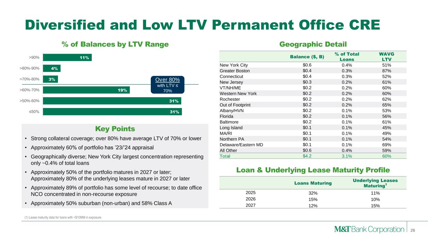 Spotlight on Permanent IRE • Hallmark of structures requires material upfront ‘skin in the game’ to ensure alignment and provide a buffer against potential future losses • Weighted-average LTV is 55%; approximately 85% of the total Permanent IRE portfolio has an LTV of 70% or less • Approximately 75% of the Permanent IRE portfolio is fixed rate, inclusive of customer implemented swaps • The risk from a decline in commercial real estate values is likely to play out over a long period of time • Approximately 50% of the permanent investor-owned portfolio matures in 2027 or later • Total NYC Permanent Multifamily of $0.9B or <1% of total loans with WAVG LTV of 55%. • Value declines in recent appraisals (2023/2024) compared to prior appraisals (2022 or earlier) are -8% for total CRE with larger declines for retail (-10%), and office (-14%) % of Loans Maturing Balance ($, B) WAVG LTV 2025 2026 2027 Multifamily $5.6 56% 29% 13% 7% Retail $4.7 52% 25% 18% 19% Office $4.2 60% 32% 15% 12% Healthcare $2.0 55% 38% 25% 8% Hotel $2.0 50% 48% 18% 9% Industrial $1.9 50% 25% 15% 13% Other $0.3 56% 20% 28% 14% Permanent $20.8 55% 31% 17% 12% Permanent IRE Details 12/31/2024 Key Points 25