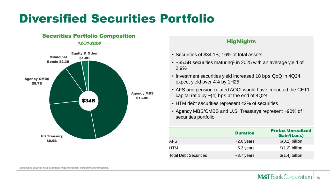 Agency MBS $16.0B US Treasury $8.9B Agency CMBS $5.7B Municipal Bonds $2.3B Equity & Other $1.0B Diversified Securities Portfolio (1) Mortgage securities include estimated prepayment under market forward interest rates. $34B Securities Portfolio Composition 12/31/2024 • Securities of $34.1B; 16% of total assets • ~$5.5B securities maturing1 in 2025 with an average yield of 2.9% • Investment securities yield increased 18 bps QoQ in 4Q24, expect yield over 4% by 1H25 • AFS and pension-related AOCI would have impacted the CET1 capital ratio by ~(4) bps at the end of 4Q24 • HTM debt securities represent 42% of securities • Agency MBS/CMBS and U.S. Treasurys represent ~90% of securities portfolio Duration Pretax Unrealized Gain/(Loss) AFS ~2.6 years $(0.2) billion HTM ~5.3 years $(1.2) billion Total Debt Securities ~3.7 years $(1.4) billion Highlights 30