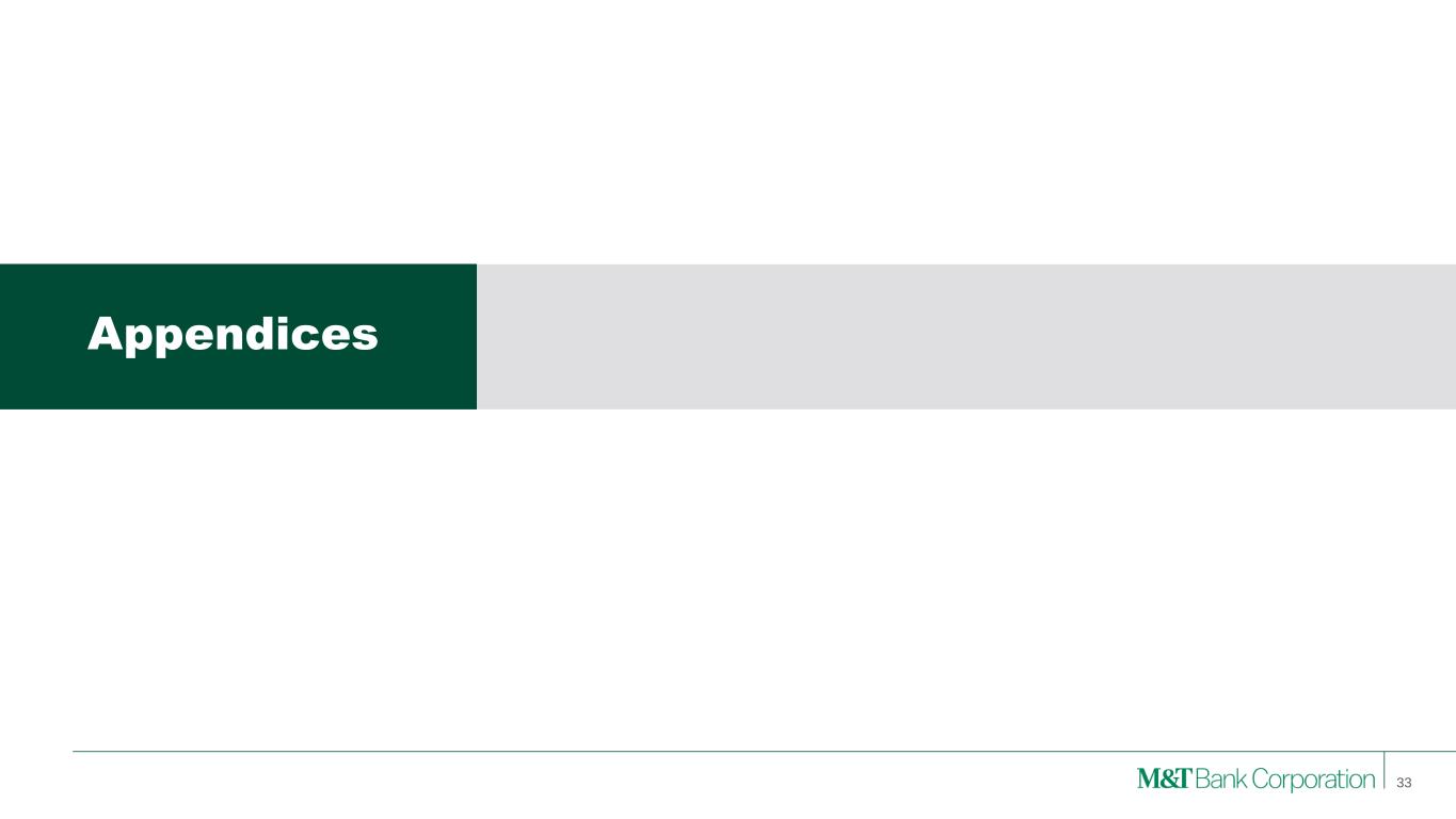 Why invest in M&T? • Long term focused with deeply embedded culture • Business operated to represent the best interests of all key stakeholders • Energized colleagues consistently serving our customers and communities • A safe haven for our clients as proven during turbulent times and crisis • Experienced and seasoned management team • Strong risk controls with long track record of credit outperformance through cycles • Leading position in core markets 32 • 15-17% ROTCE(1) • Robust dividend growth • 8% TBV per share growth(2) Source: FactSet, S&P Global, Company Filings. Note: (1) ROTCE range comprises 5 years of the trailing 3-year ROTCE from 2019-2024, consistent with M&T's measurement of ROTCE for performance-based stock compensation. (2) TBV per share growth represents CAGR from 2019-2024. Purpose-Driven Successful and Sustainable Business Model that Produces Strong Shareholder Returns Purpose Driven Organization Successful and Sustainable Business Model Strong Shareholder Returns