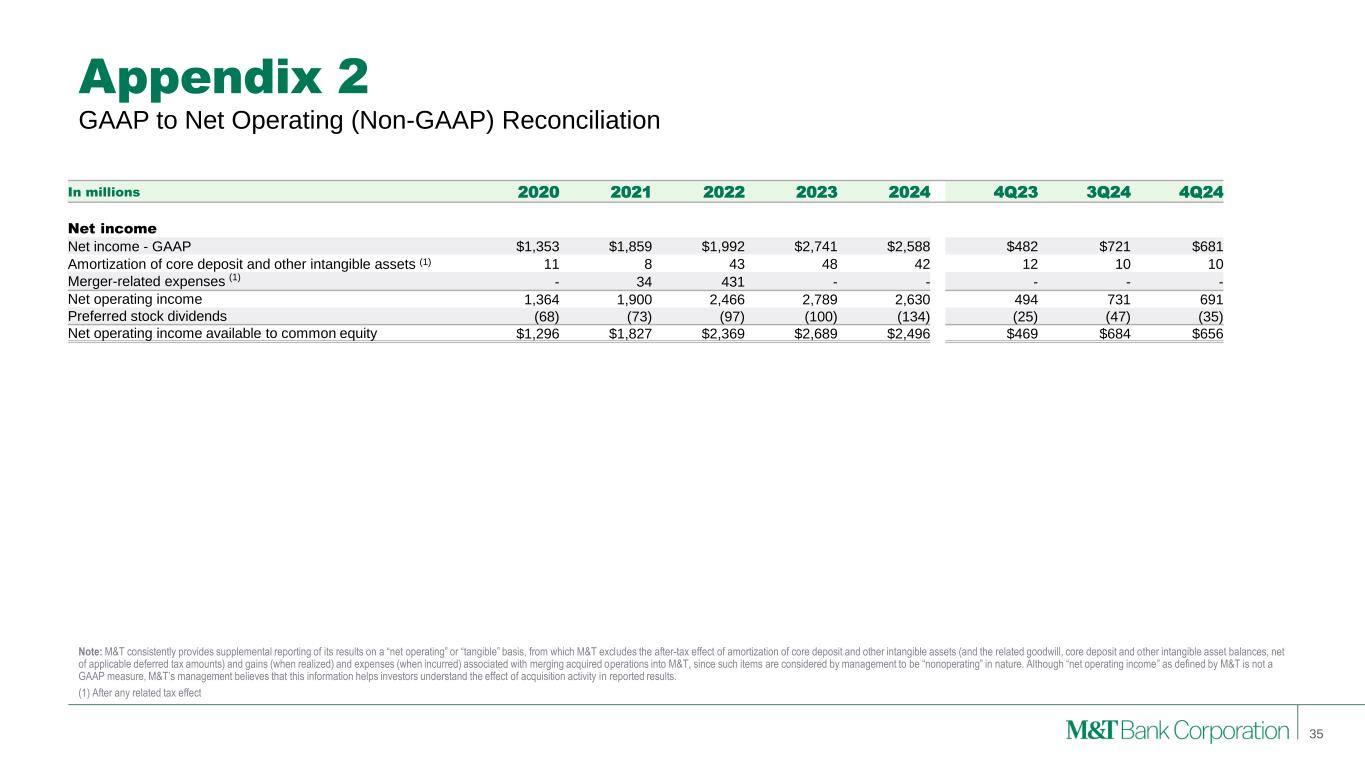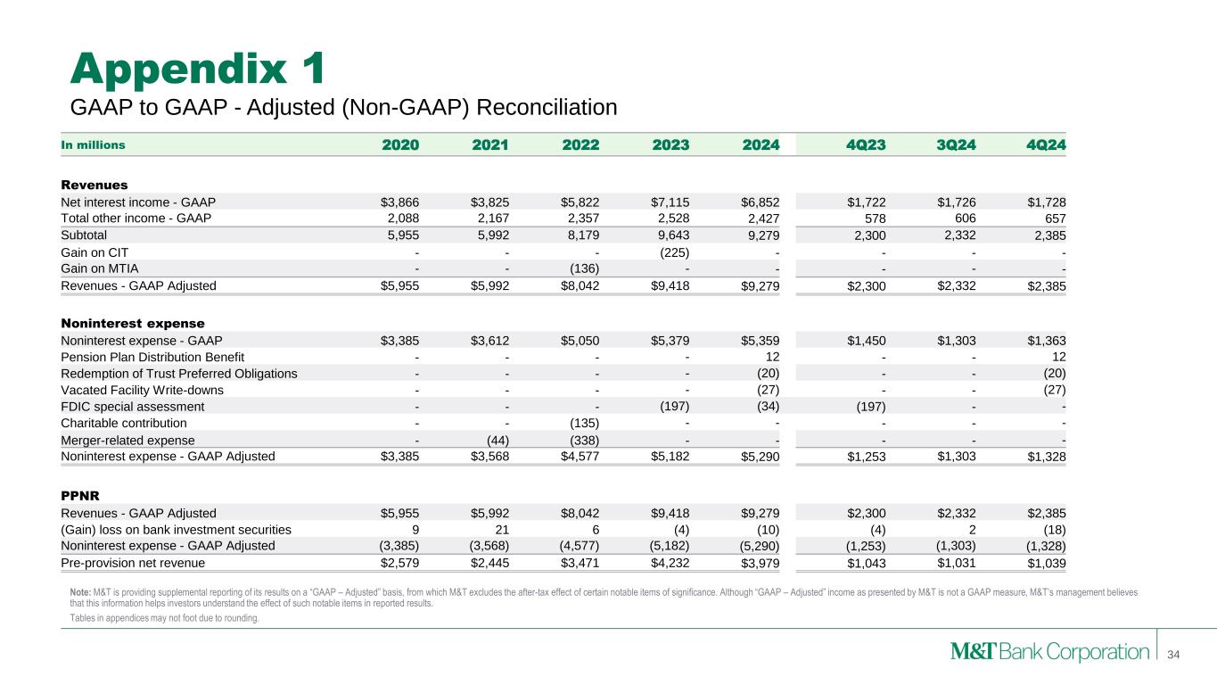 Appendix 1 Note: M&T is providing supplemental reporting of its results on a “GAAP – Adjusted” basis, from which M&T excludes the after-tax effect of certain notable items of significance. Although “GAAP – Adjusted” income as presented by M&T is not a GAAP measure, M&T’s management believes that this information helps investors understand the effect of such notable items in reported results. Tables in appendices may not foot due to rounding. GAAP to GAAP - Adjusted (Non-GAAP) Reconciliation 34 In millions 2020 2021 2022 2023 2024 4Q23 3Q24 4Q24 Revenues Net interest income - GAAP $3,866 $3,825 $5,822 $7,115 $6,852 $1,722 $1,726 $1,728 Total other income - GAAP 2,088 2,167 2,357 2,528 2,427 578 606 657 Subtotal 5,955 5,992 8,179 9,643 9,279 2,300 2,332 2,385 Gain on CIT - - - (225) - - - - Gain on MTIA - - (136) - - - - - Revenues - GAAP Adjusted $5,955 $5,992 $8,042 $9,418 $9,279 $2,300 $2,332 $2,385 Noninterest expense Noninterest expense - GAAP $3,385 $3,612 $5,050 $5,379 $5,359 $1,450 $1,303 $1,363 Pension Plan Distribution Benefit - - - - 12 - - 12 Redemption of Trust Preferred Obligations - - - - (20) - - (20) Vacated Facility Write-downs - - - - (27) - - (27) FDIC special assessment - - - (197) (34) (197) - - Charitable contribution - - (135) - - - - - Merger-related expense - (44) (338) - - - - - Noninterest expense - GAAP Adjusted $3,385 $3,568 $4,577 $5,182 $5,290 $1,253 $1,303 $1,328 PPNR Revenues - GAAP Adjusted $5,955 $5,992 $8,042 $9,418 $9,279 $2,300 $2,332 $2,385 (Gain) loss on bank investment securities 9 21 6 (4) (10) (4) 2 (18) Noninterest expense - GAAP Adjusted (3,385) (3,568) (4,577) (5,182) (5,290) (1,253) (1,303) (1,328) Pre-provision net revenue $2,579 $2,445 $3,471 $4,232 $3,979 $1,043 $1,031 $1,039