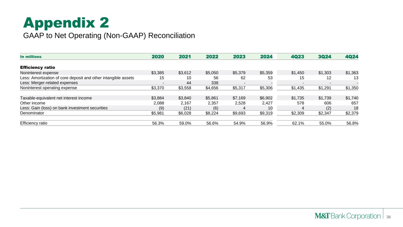 Appendix 2 Note: M&T consistently provides supplemental reporting of its results on a “net operating” or “tangible” basis, from which M&T excludes the after-tax effect of amortization of core deposit and other intangible assets (and the related goodwill, core deposit and other intangible asset balances, net of applicable deferred tax amounts) and gains (when realized) and expenses (when incurred) associated with merging acquired operations into M&T, since such items are considered by management to be “nonoperating” in nature. Although “net operating income” as defined by M&T is not a GAAP measure, M&T’s management believes that this information helps investors understand the effect of acquisition activity in reported results. (1) After any related tax effect 35 GAAP to Net Operating (Non-GAAP) Reconciliation In millions 2020 2021 2022 2023 2024 4Q23 3Q24 4Q24 Net income Net income - GAAP $1,353 $1,859 $1,992 $2,741 $2,588 $482 $721 $681 Amortization of core deposit and other intangible assets (1) 11 8 43 48 42 12 10 10 Merger-related expenses (1) - 34 431 - - - - - Net operating income 1,364 1,900 2,466 2,789 2,630 494 731 691 Preferred stock dividends (68) (73) (97) (100) (134) (25) (47) (35) Net operating income available to common equity $1,296 $1,827 $2,369 $2,689 $2,496 $469 $684 $656