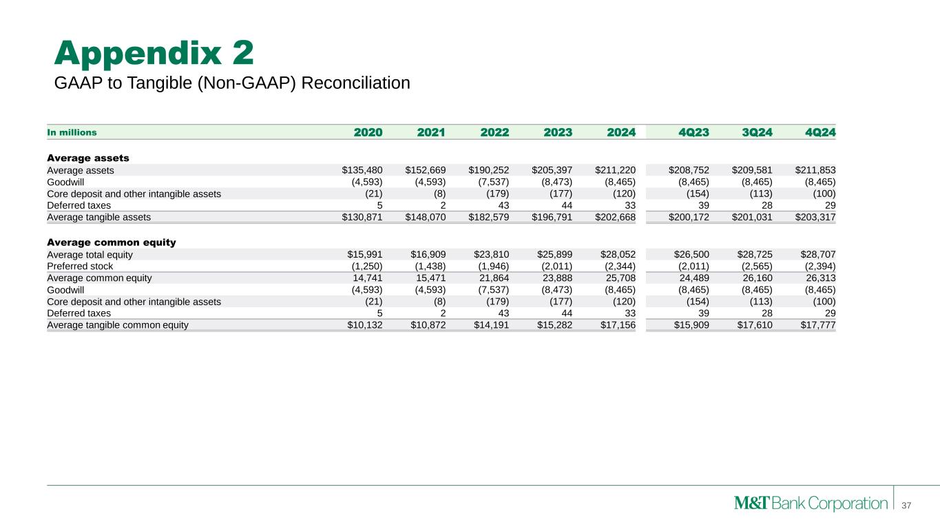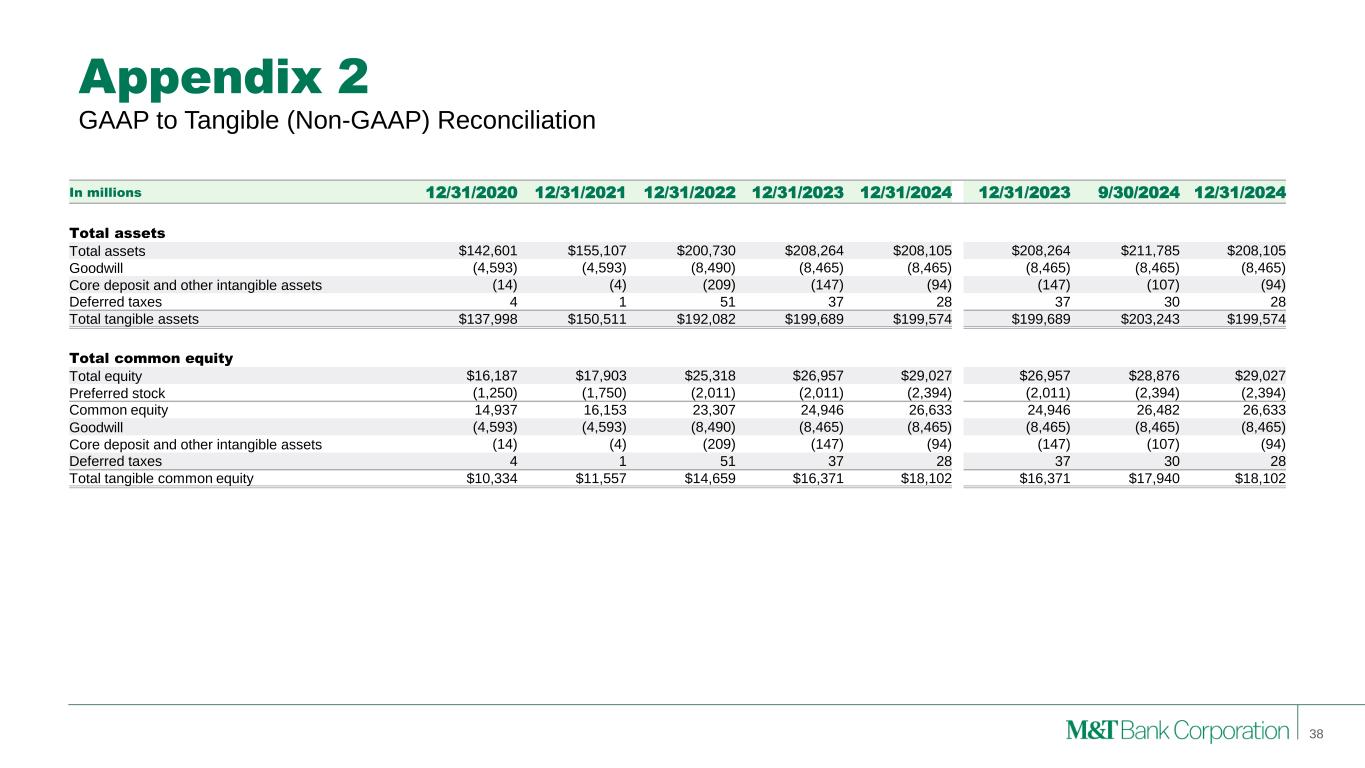 Appendix 2 GAAP to Tangible (Non-GAAP) Reconciliation 38 In millions 12/31/2020 12/31/2021 12/31/2022 12/31/2023 12/31/2024 12/31/2023 9/30/2024 12/31/2024 Total assets Total assets $142,601 $155,107 $200,730 $208,264 $208,105 $208,264 $211,785 $208,105 Goodwill (4,593) (4,593) (8,490) (8,465) (8,465) (8,465) (8,465) (8,465) Core deposit and other intangible assets (14) (4) (209) (147) (94) (147) (107) (94) Deferred taxes 4 1 51 37 28 37 30 28 Total tangible assets $137,998 $150,511 $192,082 $199,689 $199,574 $199,689 $203,243 $199,574 Total common equity Total equity $16,187 $17,903 $25,318 $26,957 $29,027 $26,957 $28,876 $29,027 Preferred stock (1,250) (1,750) (2,011) (2,011) (2,394) (2,011) (2,394) (2,394) Common equity 14,937 16,153 23,307 24,946 26,633 24,946 26,482 26,633 Goodwill (4,593) (4,593) (8,490) (8,465) (8,465) (8,465) (8,465) (8,465) Core deposit and other intangible assets (14) (4) (209) (147) (94) (147) (107) (94) Deferred taxes 4 1 51 37 28 37 30 28 Total tangible common equity $10,334 $11,557 $14,659 $16,371 $18,102 $16,371 $17,940 $18,102