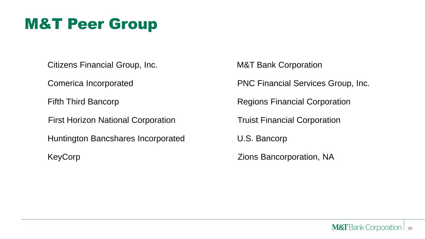 M&T Peer Group PNC Financial Services Group, Inc.Comerica Incorporated Regions Financial CorporationFifth Third Bancorp Huntington Bancshares Incorporated Zions Bancorporation, NAKeyCorp Truist Financial Corporation U.S. Bancorp M&T Bank CorporationCitizens Financial Group, Inc. First Horizon National Corporation 39